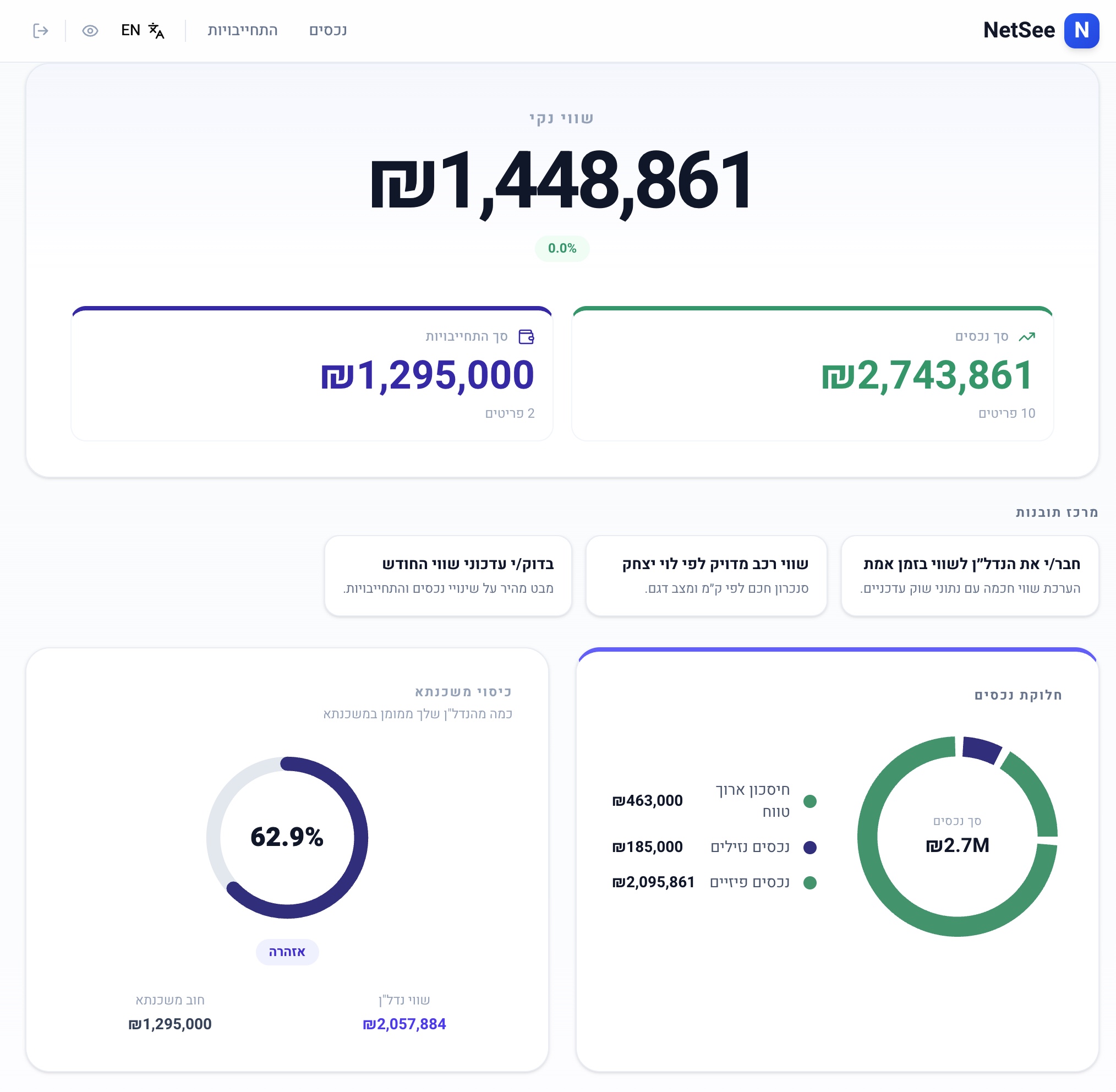 הפלטפורמה היחידה בישראל שמחברת עבורך את כל התמונה הפיננסית: מעדכון אוטומטי חודשי של קרנות הפנסיה וההשתלמות, ועד הערכת שווי חכמה של הדירה והרכב מבוססת נתוני ממשלה בזמן אמת.